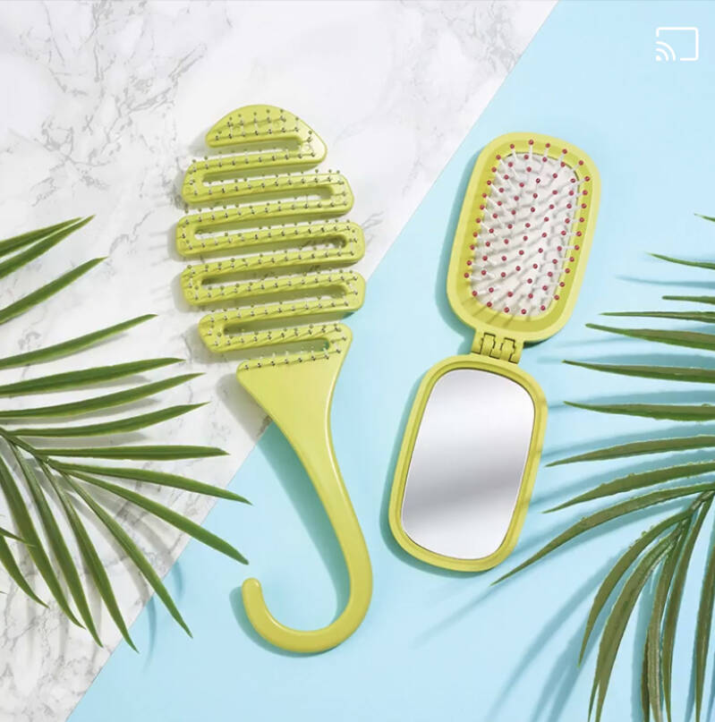 Flexible form to help detangle and with a very useful hook for quick drying, the Detangling Brush is perfect for detangling hair on-the-go or in the shower! Or you can groom on-the-go with the Pop-Up Brush! Perfect for keeping hair tangle-free and smooth. Also, it neatly folds up and pops out when you need to brush your hair or just use the mirror.